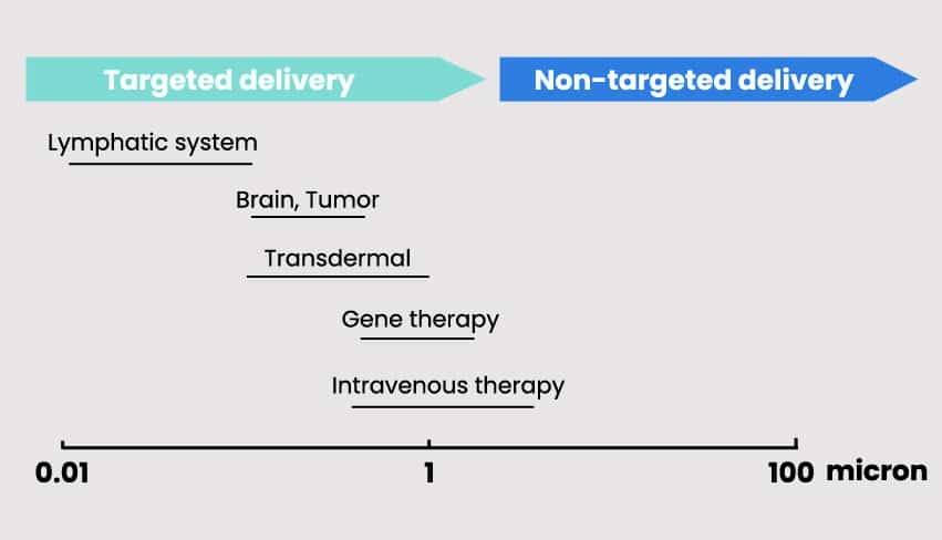 One of the key parameters to achieve targeted delivery is the ability to control the size of the drug delivery system. The targeting of tumor tissues usually requires particles in the range of 100-200 nm, whereas particles of 1-5 microns are required to target the immune system. Both size ranges can be achieved with microfluidics.